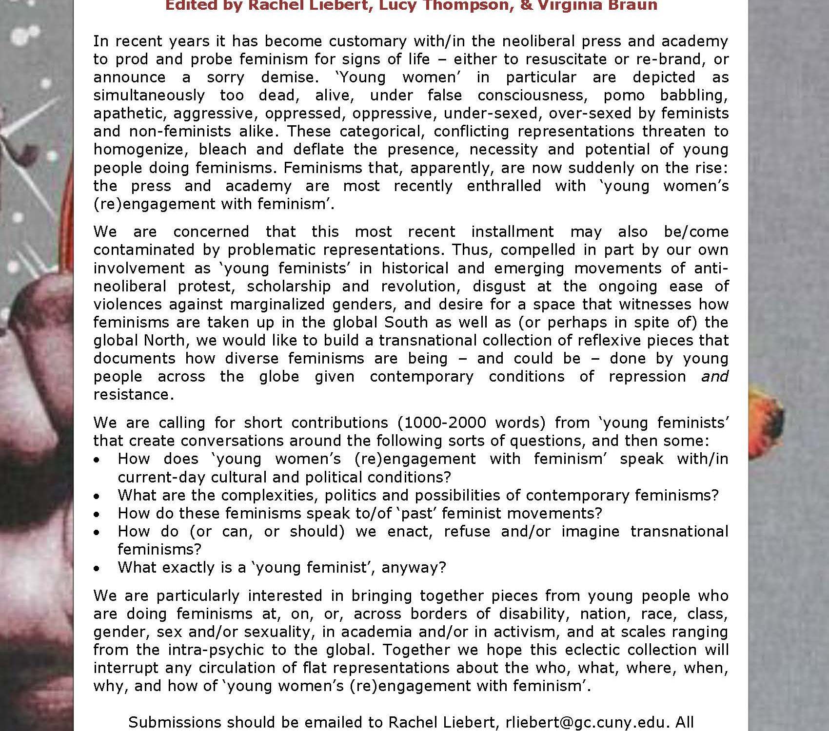 Liebert, R., & Thompson, L. (Eds, 2015). ‘‘Young Feminists” Doing Recognition & Reflexivity & (R)evolution. Feminism & Psychology Special Feature, 25(1).